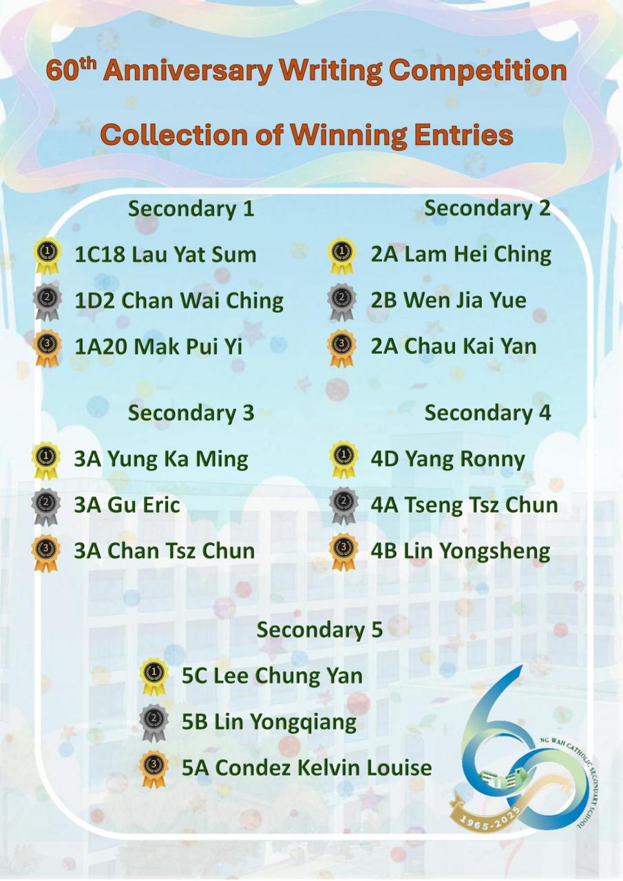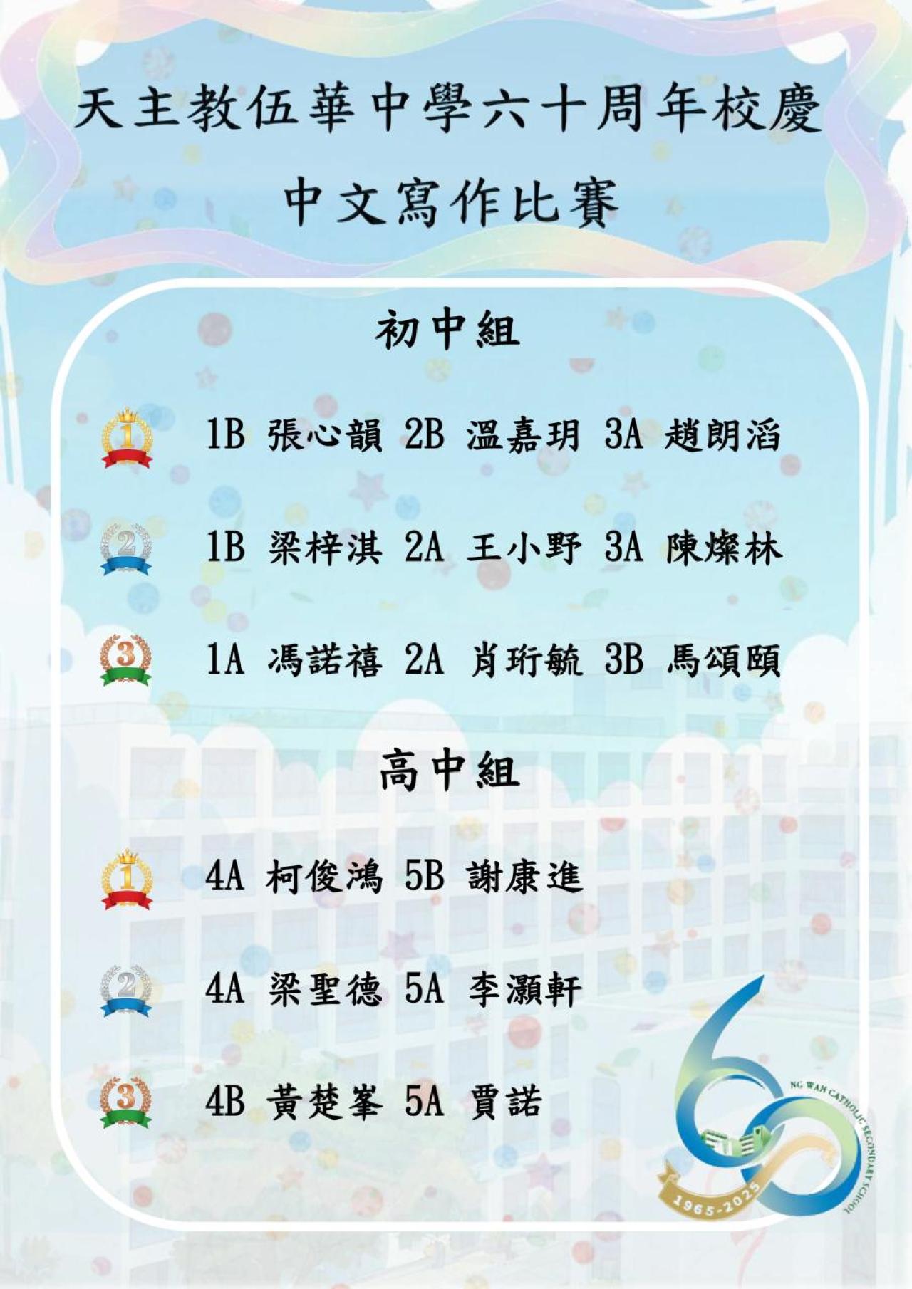 為了慶賀本校六十周年校慶,以文章表達同學的愛校之情,凝聚同學對學校的歸屬感,提升同學的寫作能力,本校中英文科組在中一至中五級分別舉行了60周年校慶寫作比賽。同學們積極參加,以優秀的文筆抒發心中所感,為校慶活動添上了亮麗一筆。