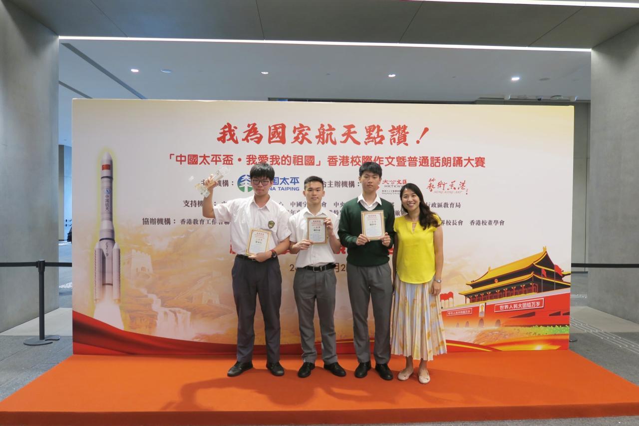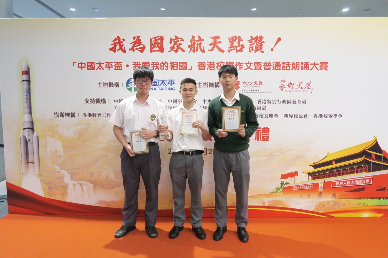 2023-10-09 「我為國家航天點讚!」由太平保險集團主辦,香港大公文匯傳媒集團、藝術香港聯合主辦的「我為國家航天點讚!『中國太平杯·我愛我的祖國』香港校際作文暨普通話朗誦大賽」。本屆賽事近百間香港中學、300多名中學生的踴躍報名,參賽選手從不同角度寫作,表達對國家航天事業30年成就的感想和點讚。經過初賽、複賽的多輪選拔後本校5A張家信、5A楊岳霖及4A劉鎮華奪得三等獎。 活動剪影