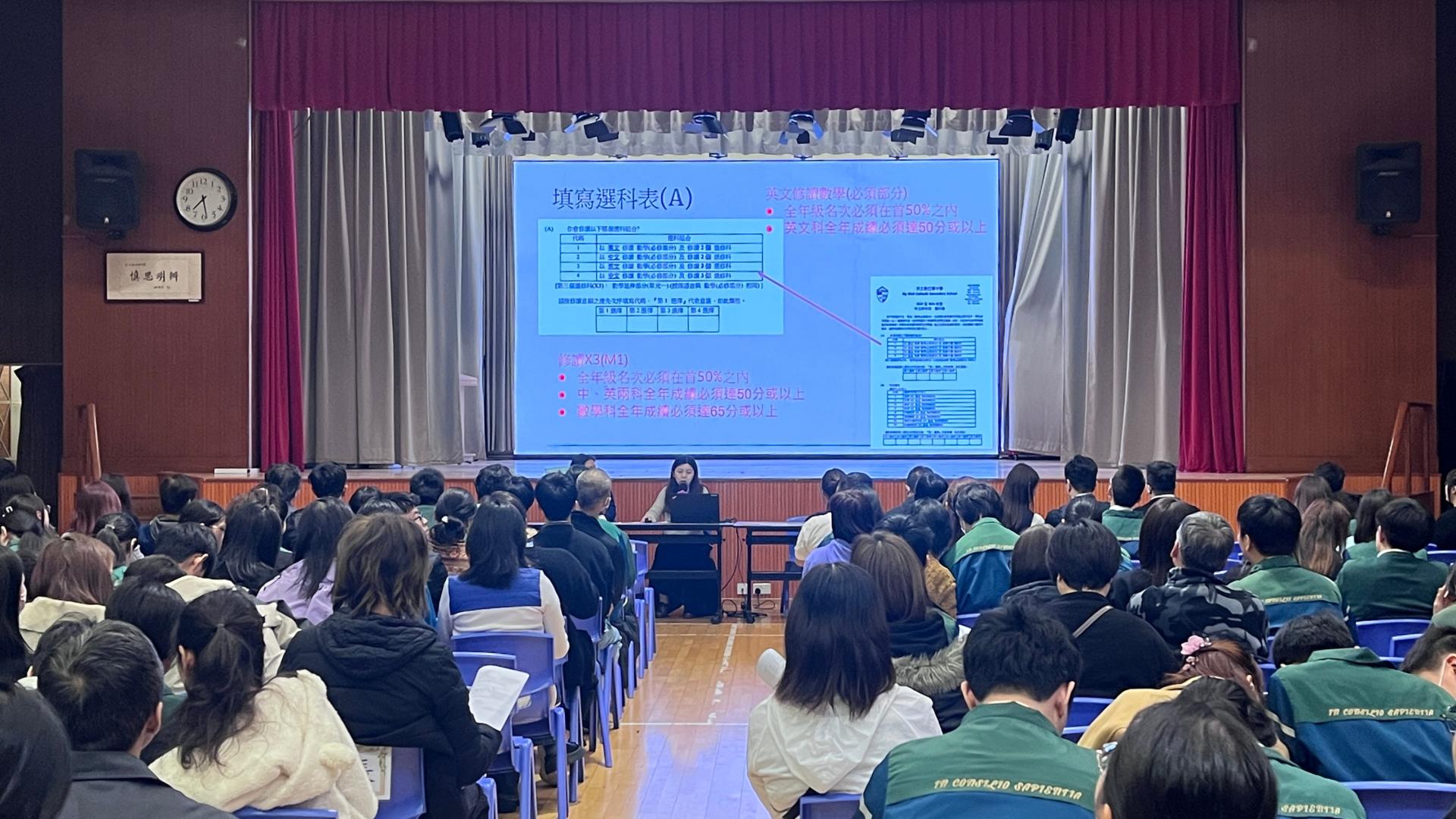 本校於 3 月 13 日 舉行中三家長及學生講座。會上詳盡解說了高中課程結構、選科機制及畢業後的多元出路。是次活動旨在讓家長與同學掌握準確資訊,為升讀中四作好準備。