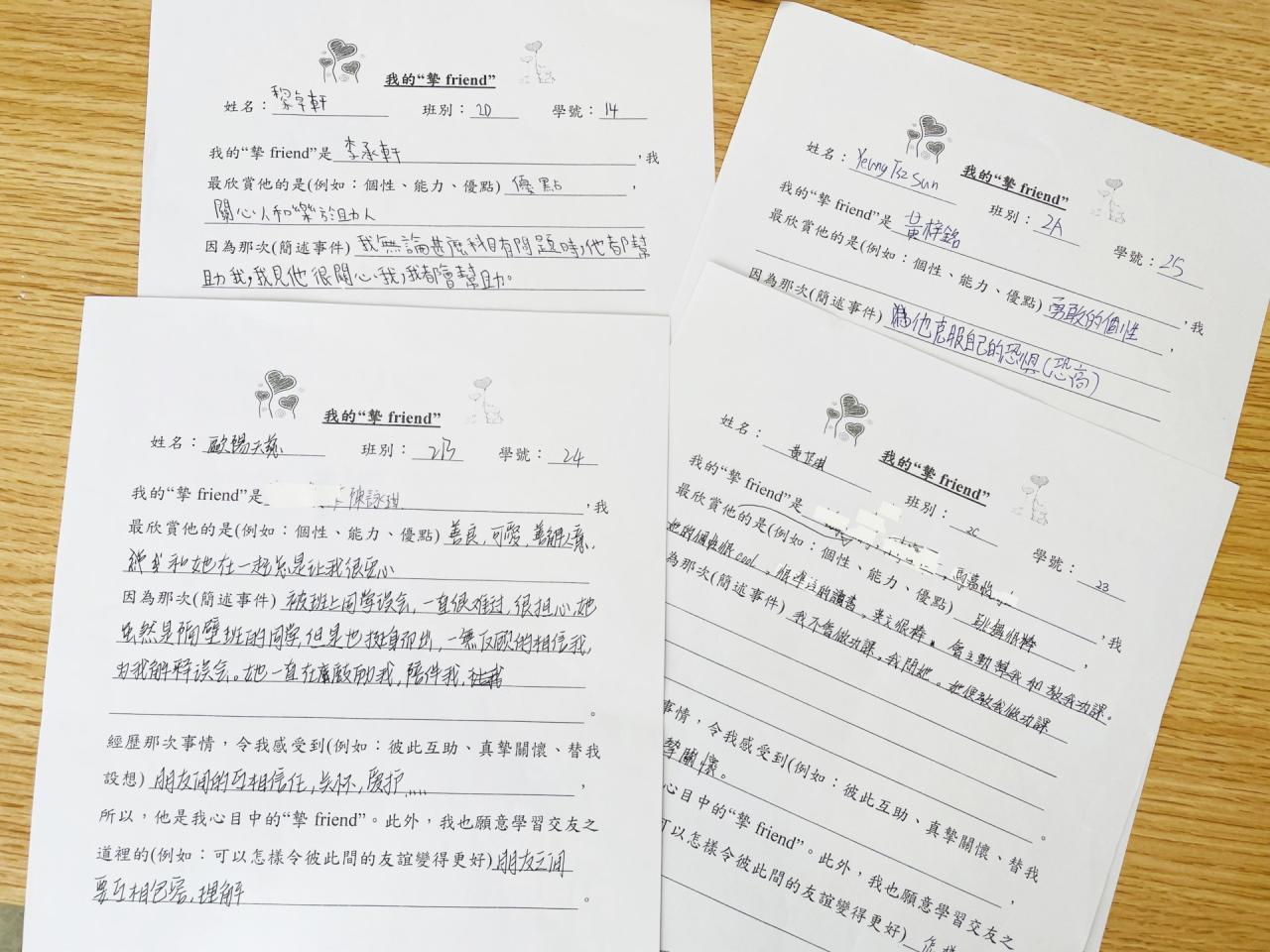 2024-01-09 中二級同學於一月九日培育課時,進行「我的摯friend選舉」活動。除了觀看老師設計和講解的錄像影片,了解交友之道及溝通技巧外,還寫下與摯友相處時的難忘片段,並藉此機會分享與好友的相處之道。 活動後,共有四組「摯Friend」贏得了獎品,包括有:2A 楊子申、2A 黃梓洺; 2B歐陽天慈、2B 陳詠琪;2C 黃芷淇、2D馬嘉怡;2D 黎卓軒、2D 李承軒。期望同學們在往後的學習路上,能與自己的「摯Friend」彼此鼓勵、互相扶持,一起面對成長的挑戰。 活動剪影
