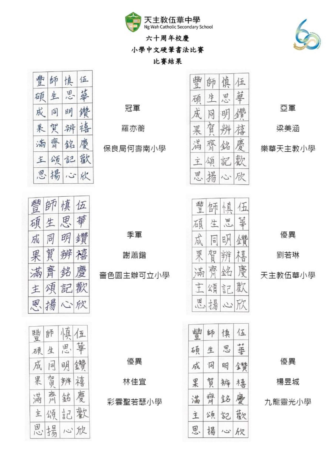 為慶祝鑽禧校慶及弘揚中文書法藝術及書寫風氣,本校邀請多所小學參與中文及英文硬筆書法比賽,比賽結果及得獎作品可參閱附件。