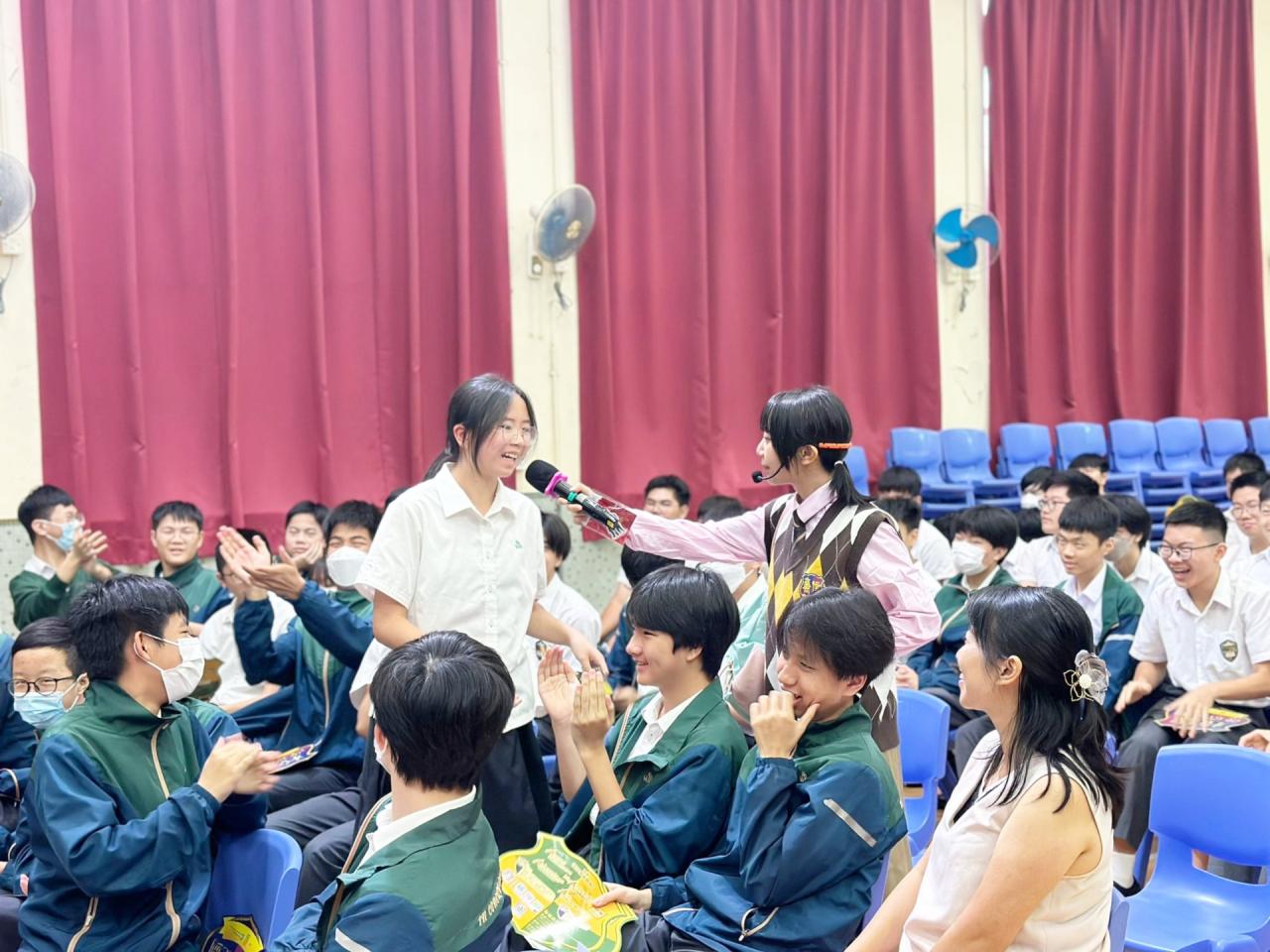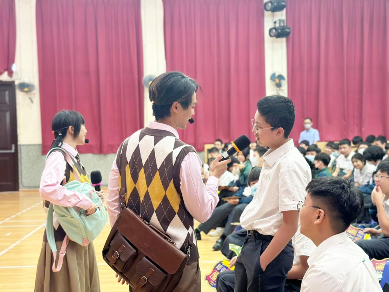由廉署安排專業劇團到校演出互動倡廉話劇,帶出貪污禍害、 如何處理誠信挑戰及守法和尊重法治的重要性。