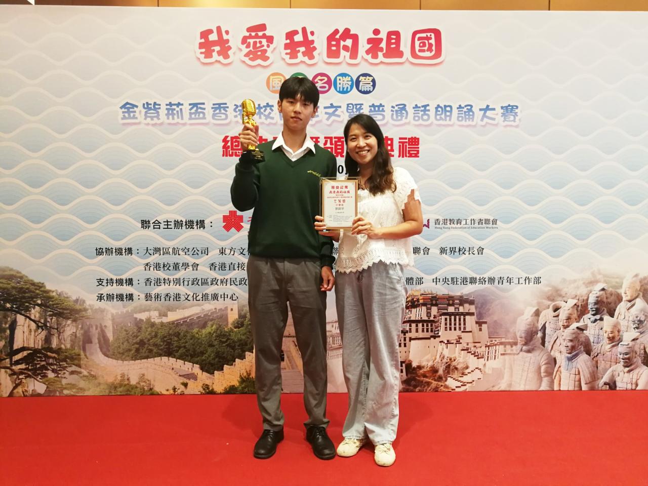 2023-10-09 由香港潮州商會主辦,香港大公文匯傳媒集團,藝術香港,香港教育工作者聯會聯合主辦的第二屆「我愛我的祖國」香港校際作文暨普通話朗誦大賽。全港近百間中小學各推薦一名學生參賽,經過多場選拔本校5A劉鎮華奪得三等獎,獲贈大灣區航空公司來回台灣機票一張。 於香港故宮文化博物館舉行頒獎典禮 第二屆「我愛我的祖國」香港校際作文暨普通話朗誦大賽 5A劉鎮華奪得三等獎 活動剪影