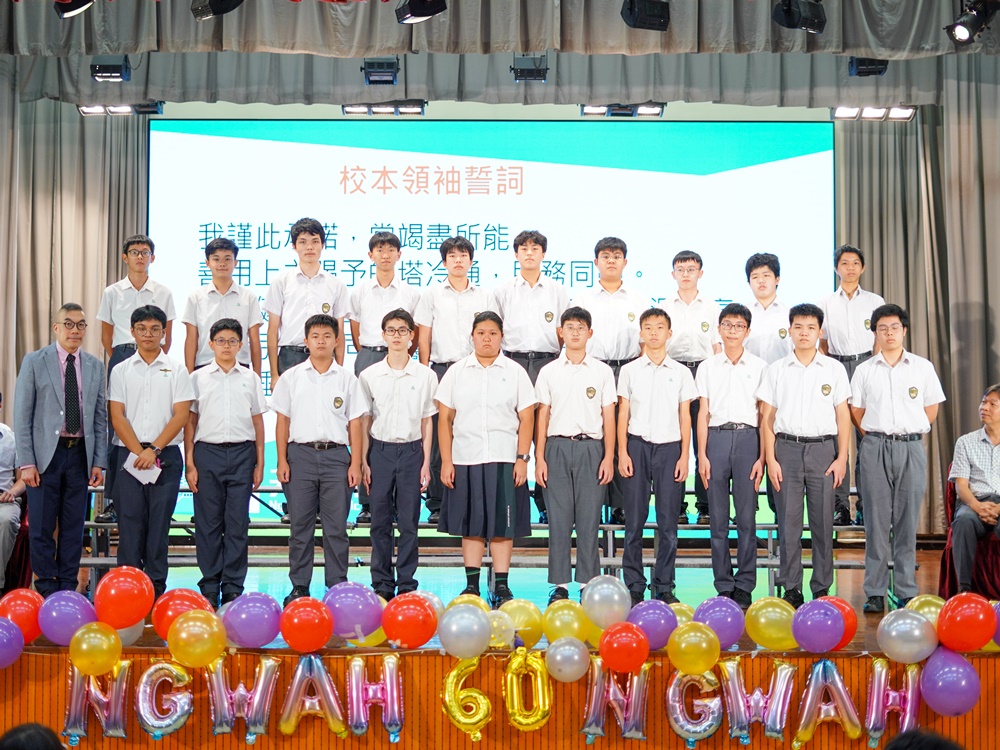 本校於2024年9月24日舉行2024-2025年度學生領袖就職典禮。典禮上,學生會、領袖生、級社、校本領袖及一人一職班本領袖在三位副校長的監誓下宣誓就職,承諾為學校及同學服務。 今年學校主題為「健康人生,心寬志強,積學活用,生涯閃亮」,鼓勵學生領袖以開闊胸襟、堅毅意志服務學校,將所學應用於生活中。 典禮同時舉行「我的行動承諾──全港同『諾』禮」活動,全體師生一同宣讀承諾,表達感恩珍惜、積極樂觀的生活態度。 校長亦透過影片致訓勉詞,為學生領袖帶來啟發和鼓舞。