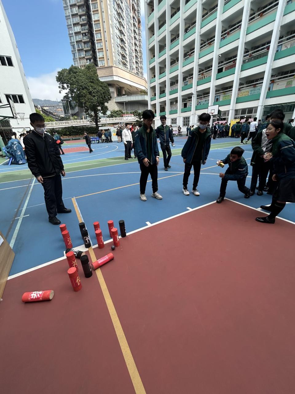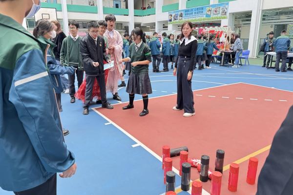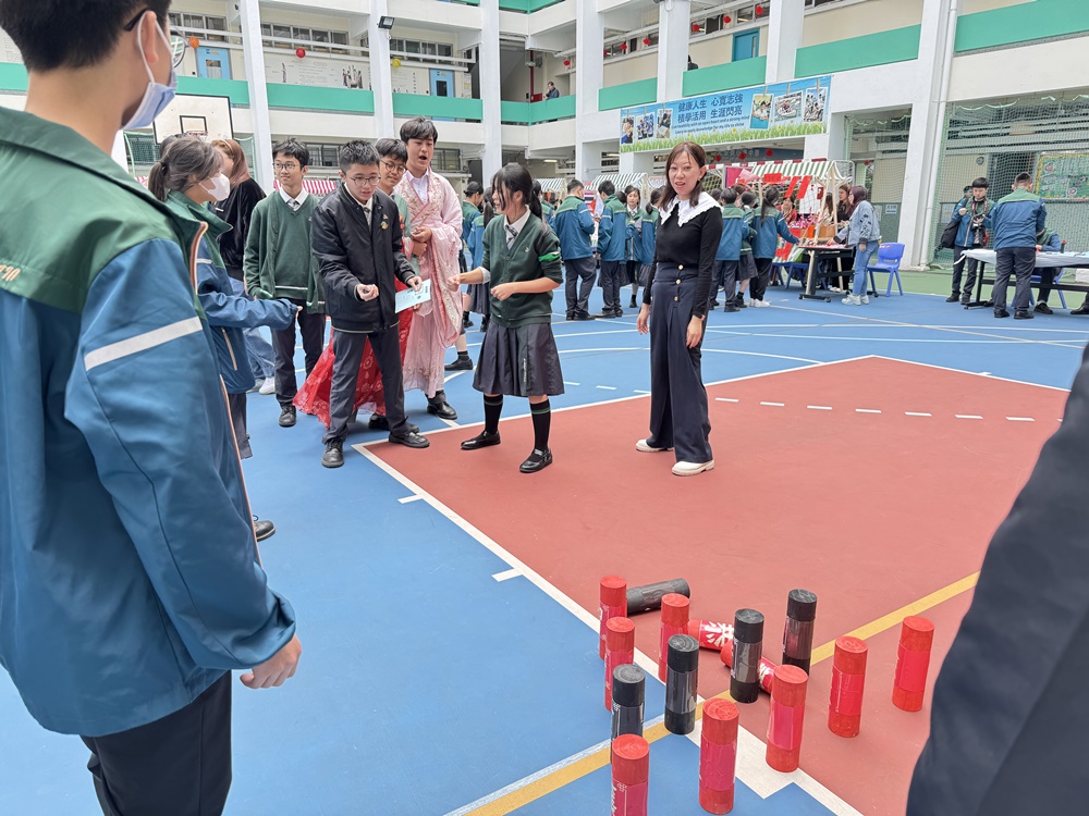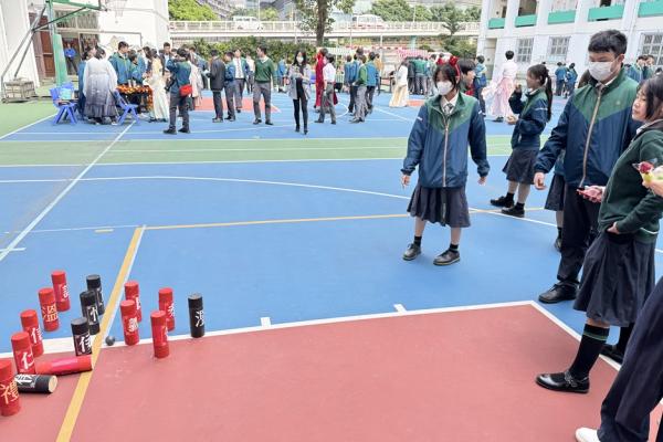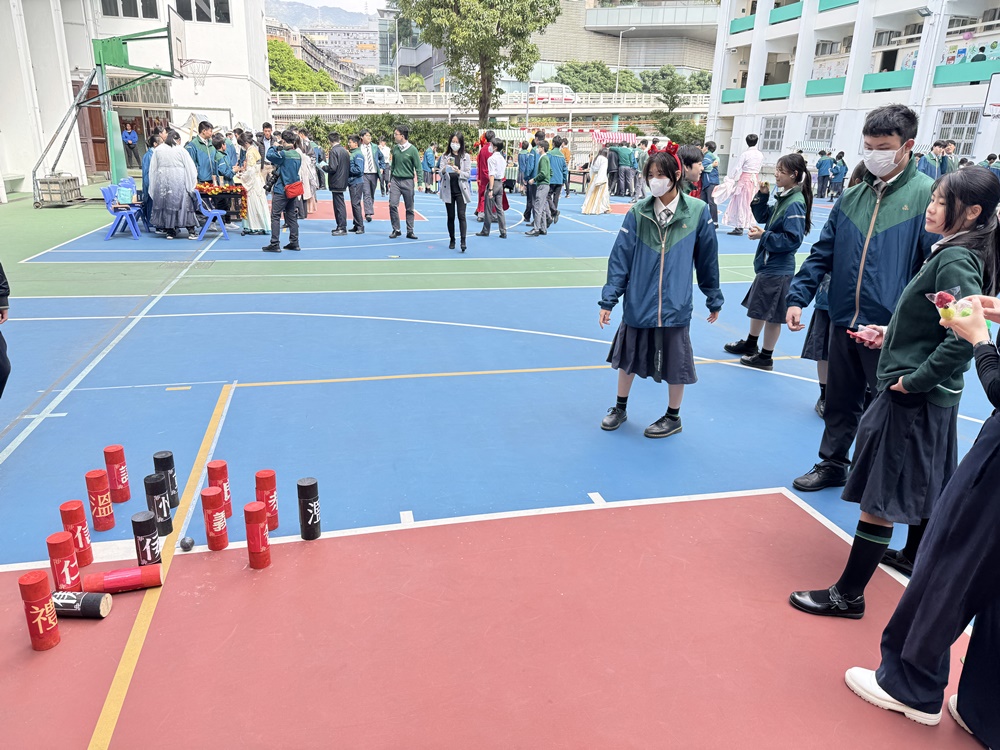 2025-03-08 木射始於唐代的球類遊戲,每位參加同學可領兩球, 手持球從地面滾撃木柱,撃中赤書木柱加分,撃中墨書木柱減分, 透過遊戲讓同學體驗古人的活動,及認識「仁、義、禮、智、信、溫、良、恭、儉、讓」 十種中國傳統的美德,同學反應熱烈,踴躍參與。