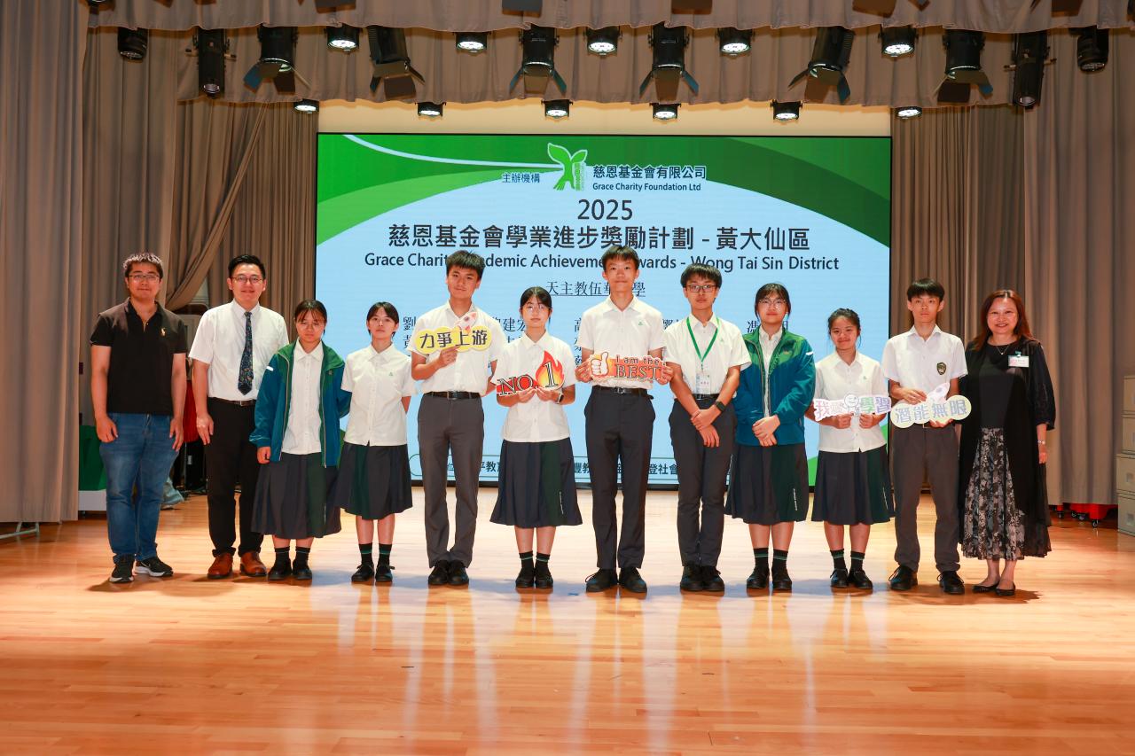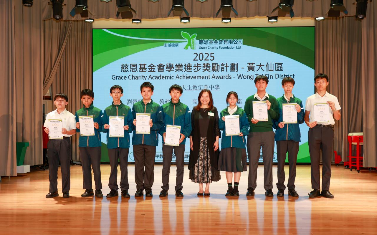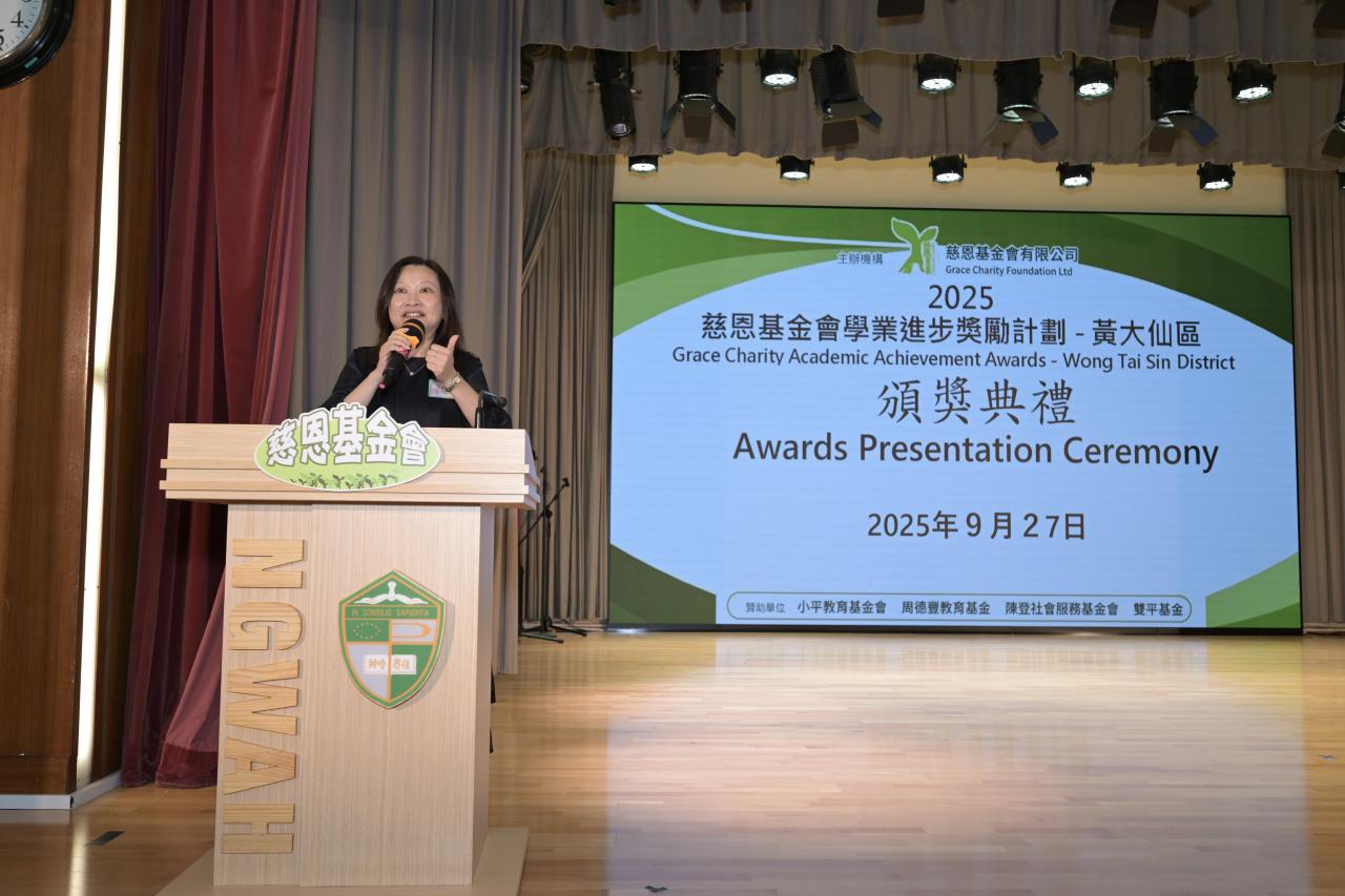 2025-09-27 「2025慈恩基金會學業進步獎勵計劃」頒獎典禮為激勵同學自我完善、力臻卓越,慈恩基金會積極支援學界,更慷慨捐助獎學金予學業成績有明顯進步及品行優良的同學。於2024-2025年度,本校共15名同學表現傑出,並成功獲獎。 為隆重其事,慈恩基金會於2025年9月27日,假本校禮堂舉辦了「2025慈恩基金會學業進步獎勵計劃」頒獎典禮,教育局總學校發展主任(黃大仙)馮俊文先生、陳登社會服務基金會陳玉坤女士、伍旬節聖潔會永光書院郭文坤校長、本校李宛儀校長暨各校校長及師生都抽空出席,場面熱鬧。